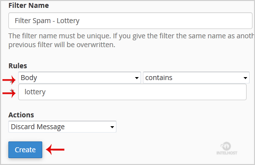 5. In the filter rules, you can filter email with many options, and should you want to deal with email, which contains a word like Lottery or other words, then in the first list box select Body and select Contains in the second list box.