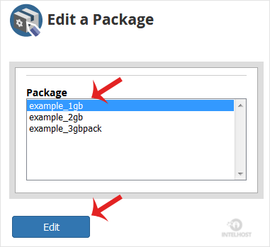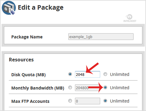4. Under Edit a Package, you can modify Resources like Disk space, Bandwidth, etc.