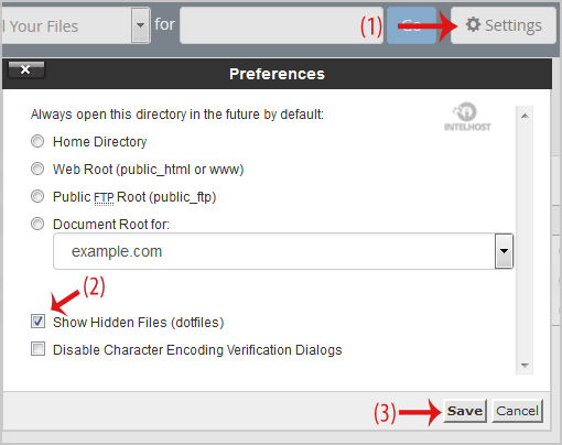 5. If the .htaccess file does not show, click on the Settings button in the File Manager. You can find the Settings button on the Right Side of the top menu. A new small window will open. Mark the Show Hidden Files (Dotfiles) option and click on the Save button. You will be able to see the .htaccess file. If it does not exist, create a new one.