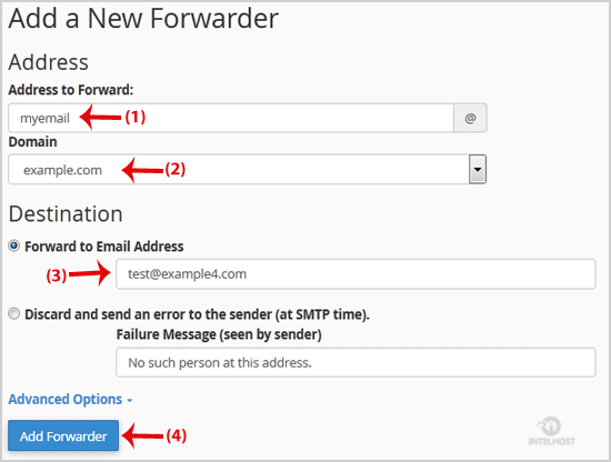 Step 3: On the Add a New Forwarder page, you will see the Address to forward: field. If you want to forward your myemail@example.com to your custom e-mail address, enter my-email in the Address to forward, field and should you have multiple domains, select the appropriate one from the domain drop-down list.
