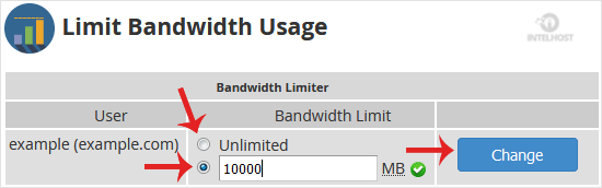 4. Under Bandwidth Limit, select the Unlimited radio box for unlimited bandwidth or type the value in the field box and then click the Change button.