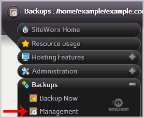 2. Under SiteWorx Menu, click the Backups menu item if it is not already open.